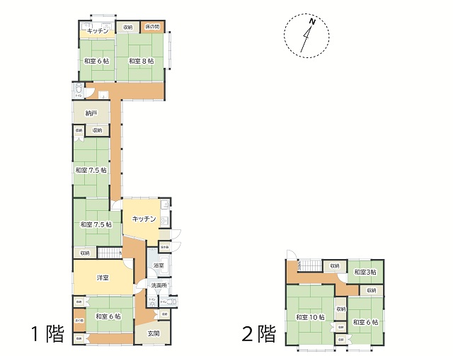 間取り1階和室8帖、7.5帖×2、6帖×2、洋室、DK、K、納戸