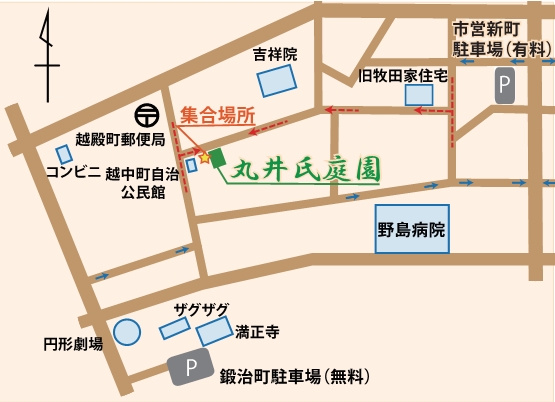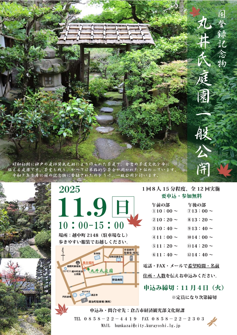 昭和初期に神戸の庭師巽武之助(たつみ たけのすけ)により作られた茶庭で、倉吉の茶道文化を今に伝える庭園です。茶室も残り、かつては本格的な茶会が開かれたと伝わっています。