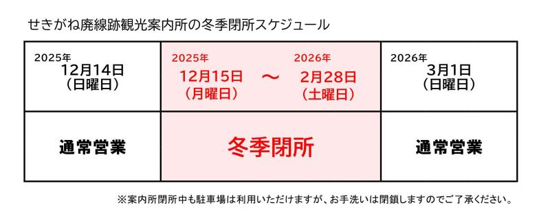 今年度のせきがね廃線跡観光案内所は、2025年12月15日(月曜日)から2026年2月28日(土曜日)まで冬季閉所となります。これに伴い、案内所内のお手洗いもご利用いただけませんのでご了承ください。ただし、泰久寺駅前に設置している仮設トイレはご利用いただけます。また、案内所の駐車場は通常どおりご利用いただけます。