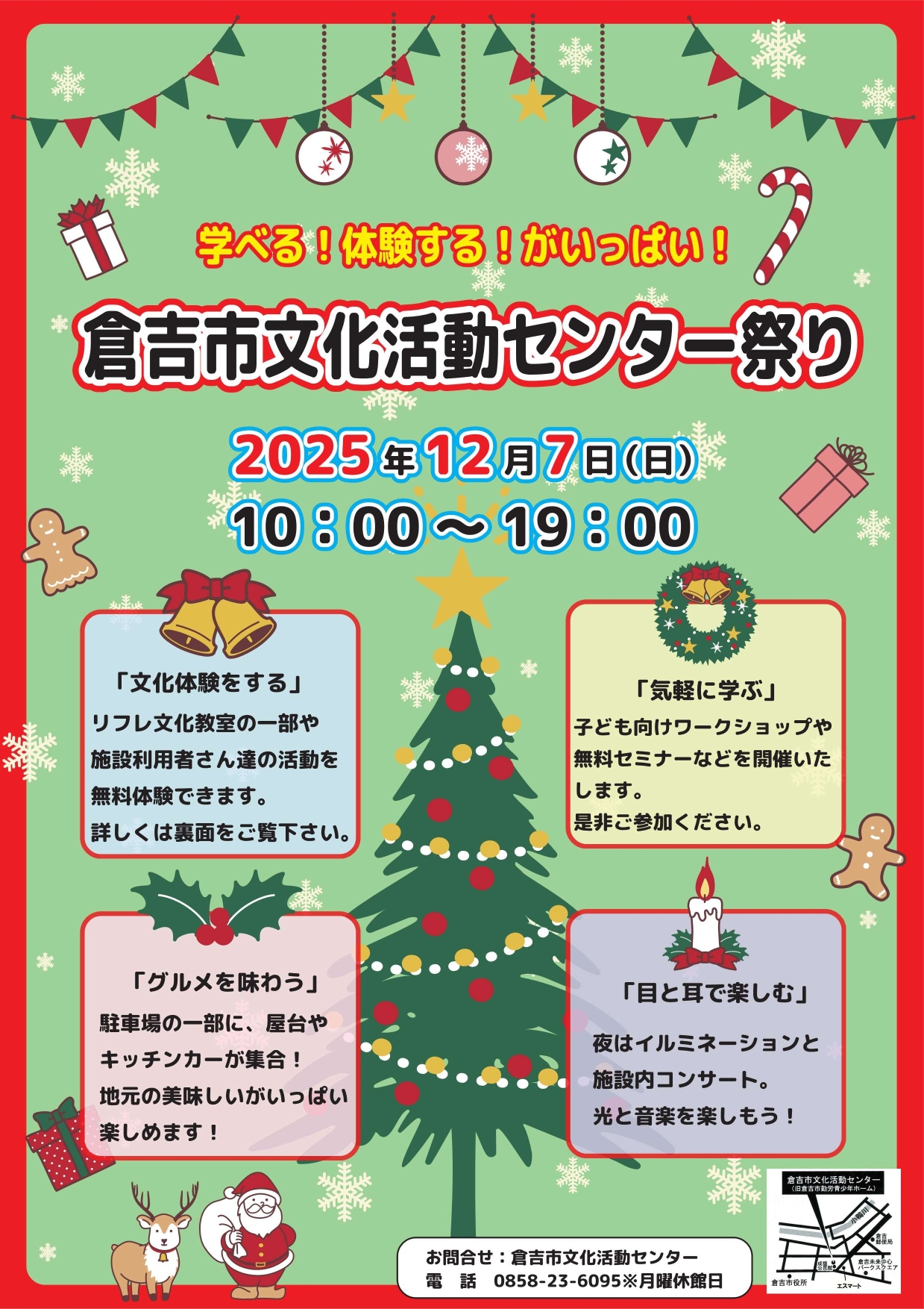 倉吉市文化活動センターでは、市民の皆さまに気軽に文化活動に触れていただくため、「倉吉市文化活動センター祭り」を初開催します! どなたでも楽しめる催しが満載です。ぜひご来場ください!