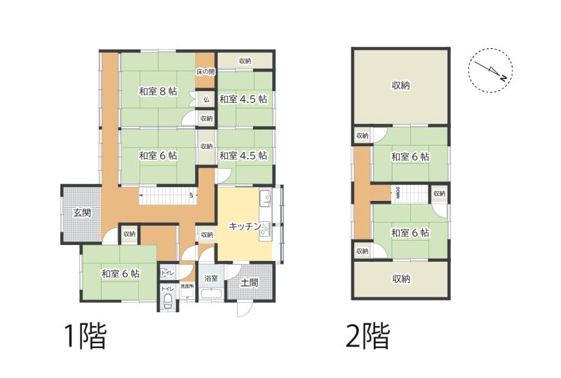 間取り1階和室6帖×3、和室4.5帖×2、キッチン
