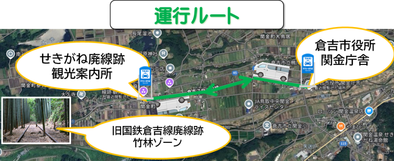 倉吉市役所関金庁舎(倉吉市関金町大鳥居193-1)⇔ せきがね廃線跡観光案内所 (倉吉市関金町泰久寺77-1)