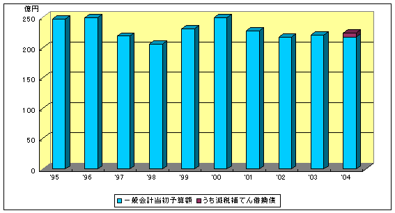 グラフ上の数値は2002年度(平成14年度)までは決算、2003年度(平成15年度)は決算見込、2004年度(平成16年度)は当初予算の数値で算出しています。