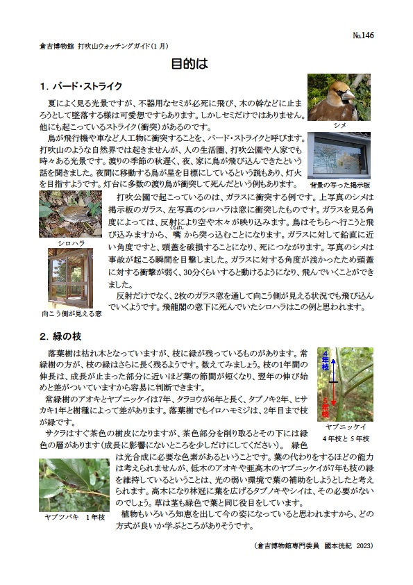 1月 No.12 縁起もの No.24 温暖化は大敵 No.36 冬に区別する No.48 侵入者 No.60 赤い実のめでたさ No.72 生きるすべ No.84 打吹山のイヌ○○ No.96 食べ物探し No.108 実態は No.120 ごちそう? No.133 生存戦略の 良し悪し No.146 目的は No.168 つながり