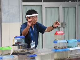 採集の後は、生き物の入った水槽を机に並べ、先生方に解説いただきました。カワムツやモクズガニ、ハグロトンボのヤゴなど10種類以上の生き物が生息していることがわかりました!その他、アメリカザリガニやモクズガニの雌雄の見分け方なども教えていただきました。