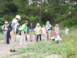 はじめに宇野海岸の周辺で海岸植物を観察しました。芳香のあるハマゴウ、葉がざらつくことが名前の由来となったネコノシタなど、たくさんの海岸植物が開花していました。植物の香りや感触を楽しみました。